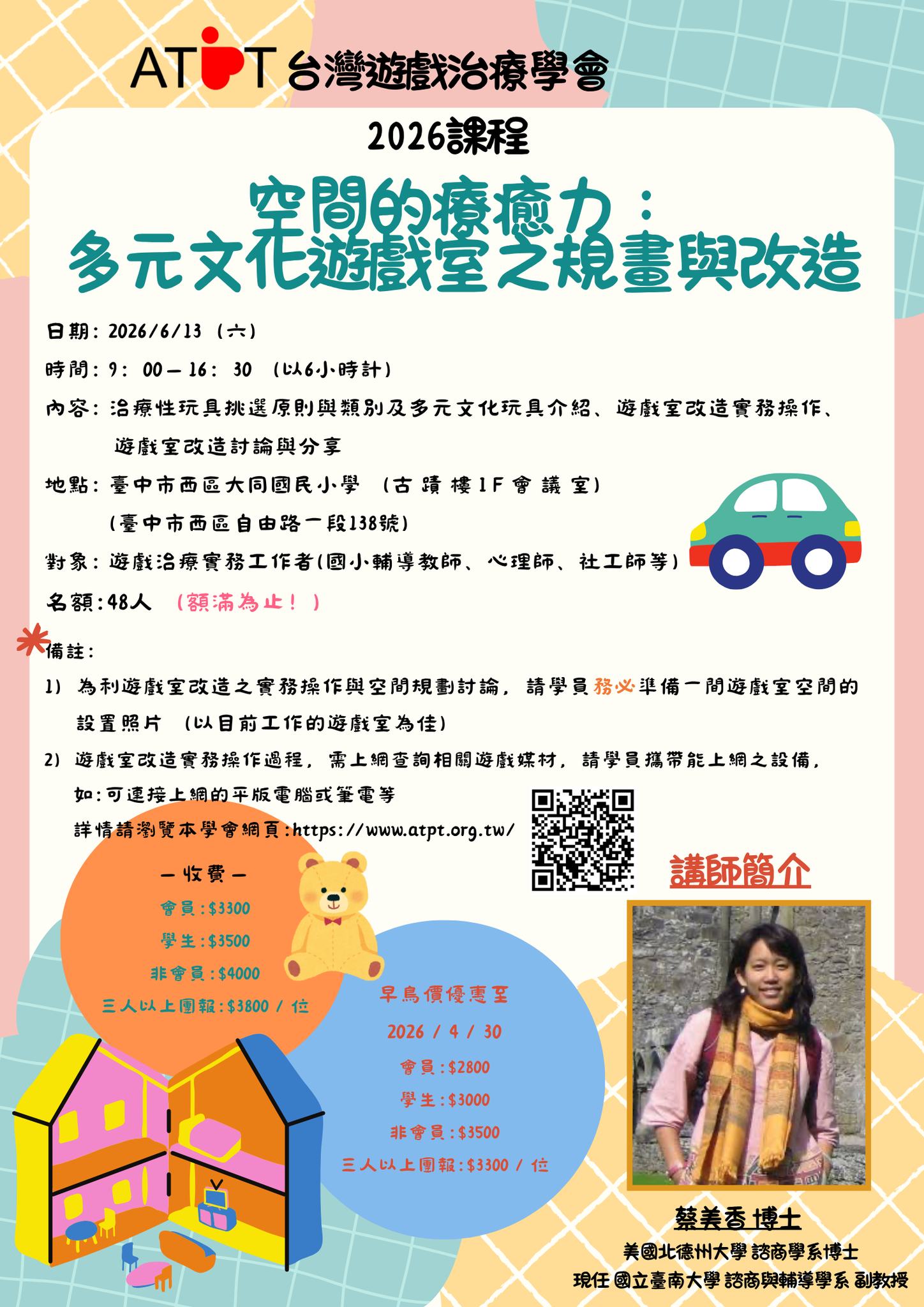 | 2、 | 於04/30前完成報名並繳費者,享有早鳥優惠價!請參考學會報名網站(https://www.atpt.org.tw/course-id-216)。 |