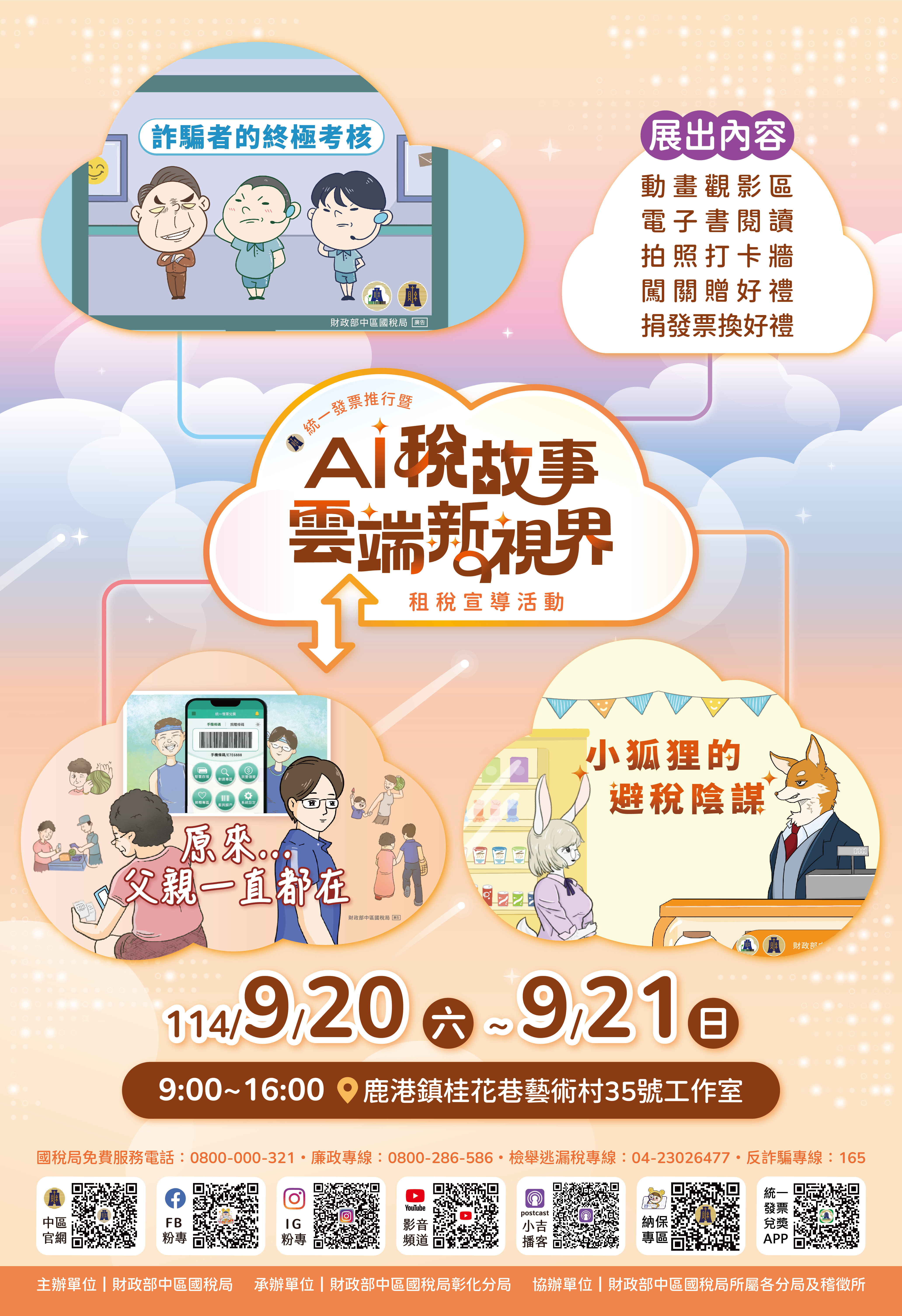 為鼓勵民眾購物消費時使用載具存取雲端發票,財政部中區國稅局主辦114年度統一發票推行暨「AI稅故事 雲端新視界」租稅宣導活動,鼓勵同仁、師生、家長及民眾踴躍參加。 |