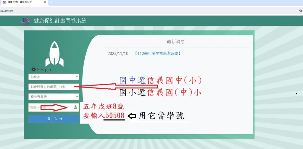 請注意 「班級學號」 範例:七年甲班8號 是「 70108 」